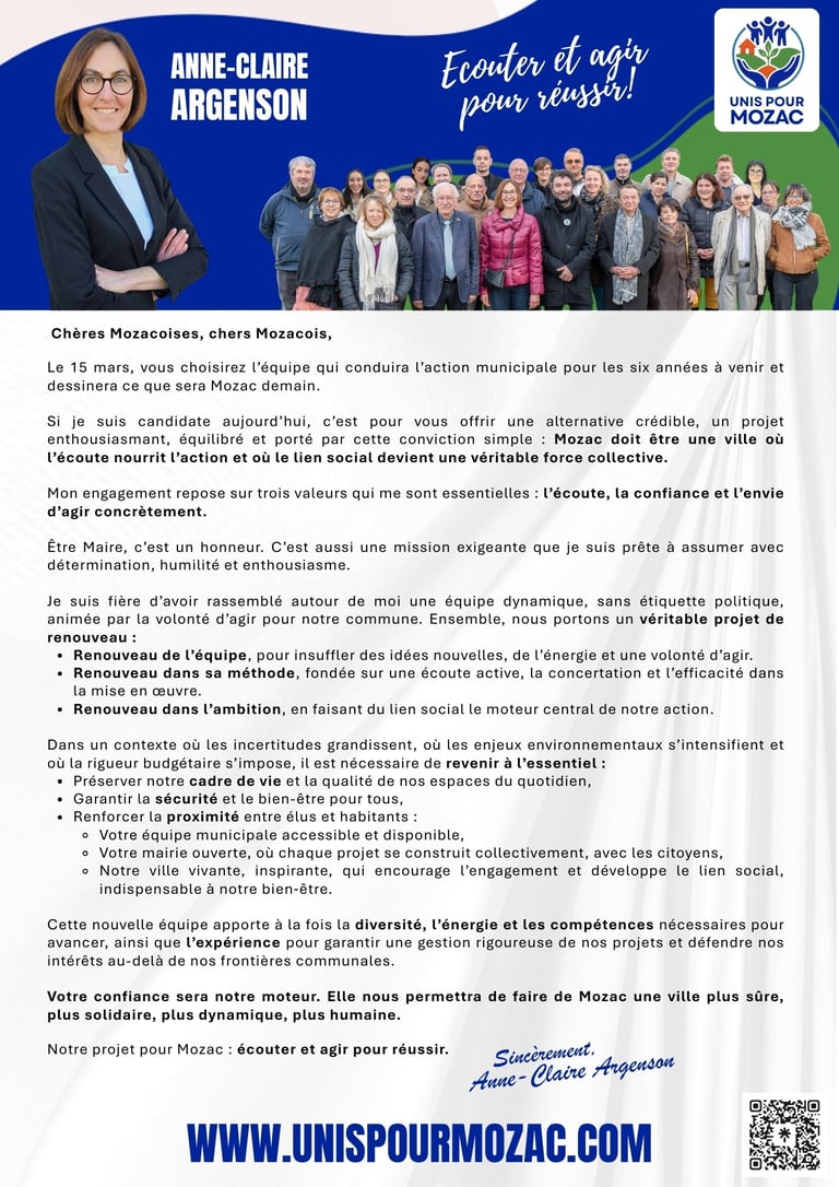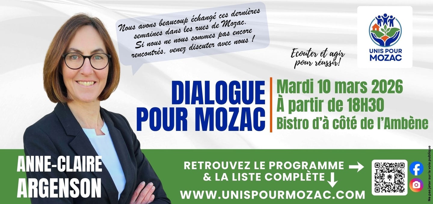 Après plusieurs semaines de rencontres et de travail, Anne-Claire Argenson et l’équipe Unis pour Mozac vous présenteront les grandes orientations de leur projet pour notre commune.
