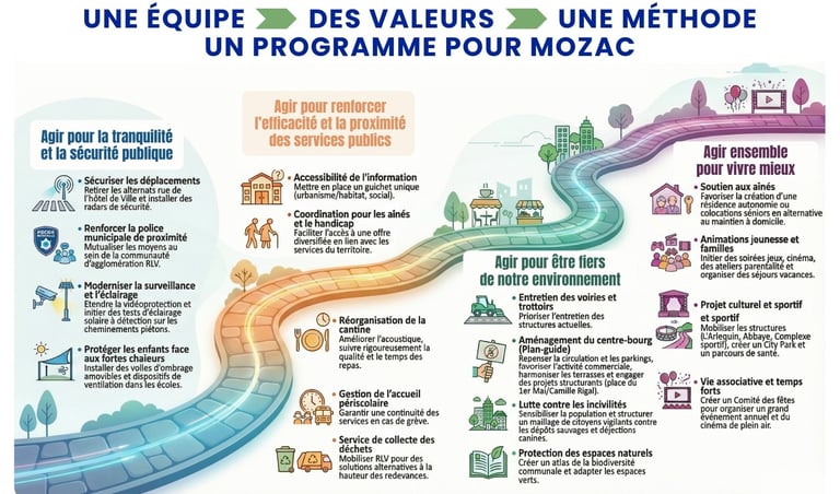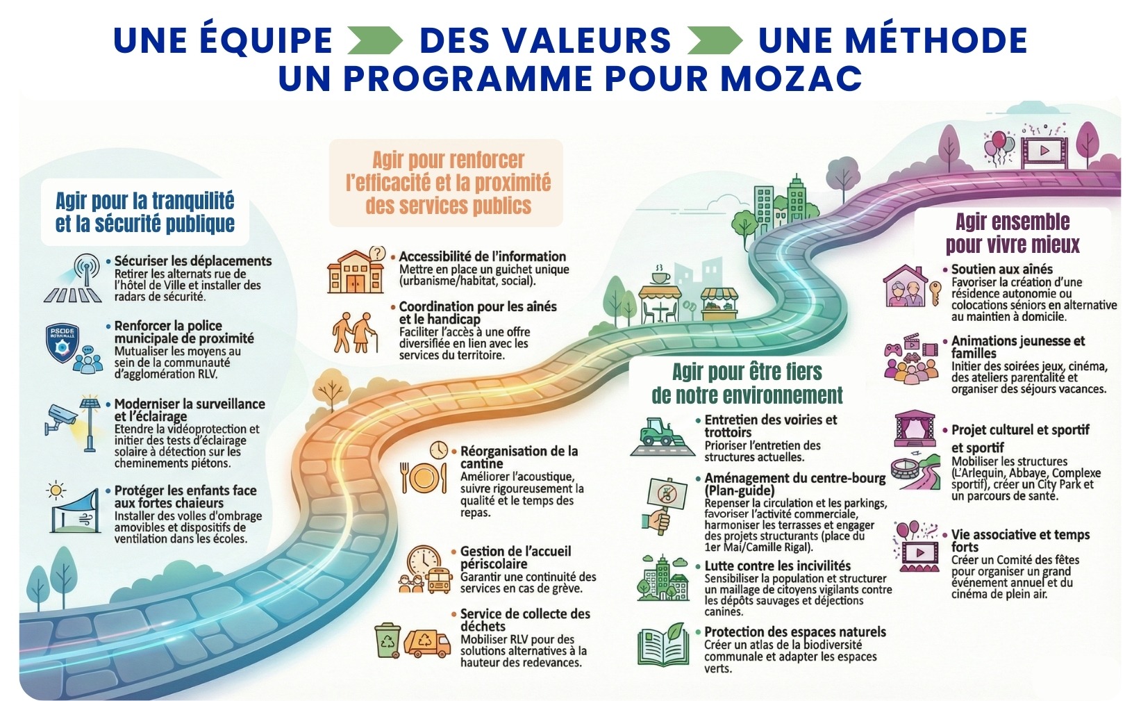 Indépendante de tout parti politique, notre équipe avance avec une seule boussole : agir chaque jour dans l’intérêt général, au service de toutes les Mozacoises et de tous les Mozacois.