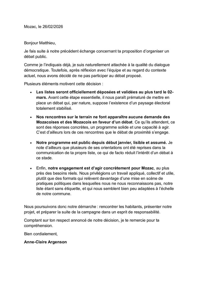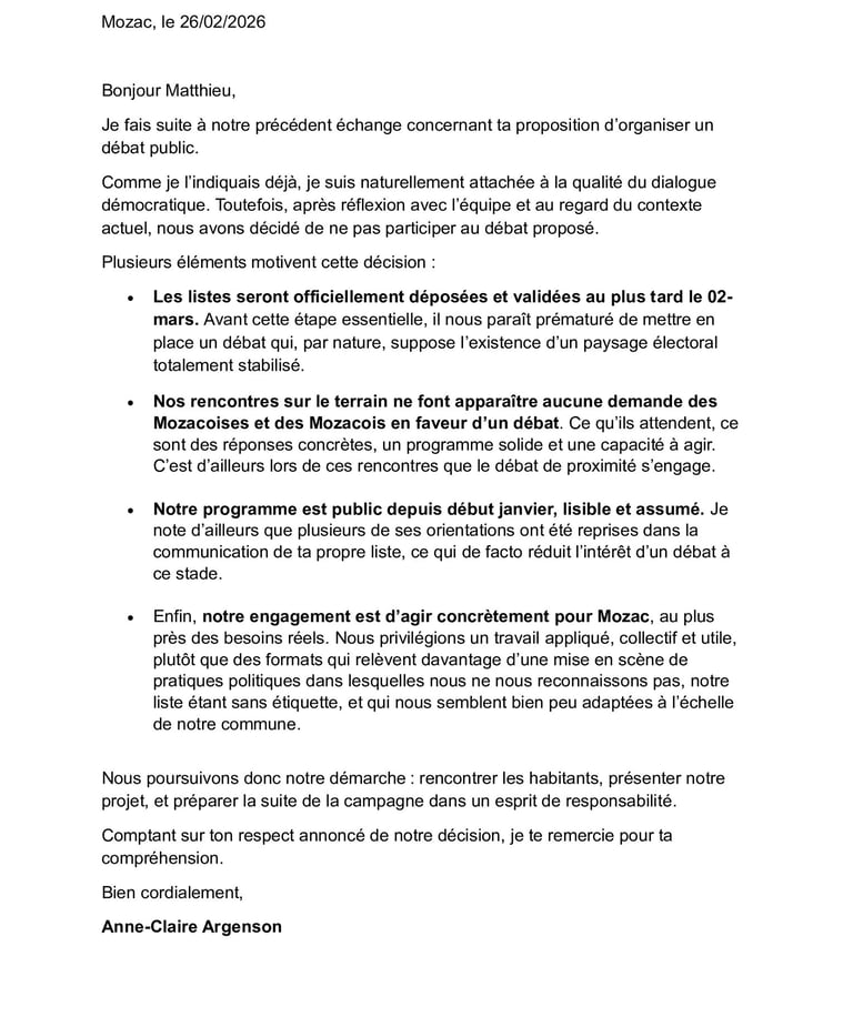 Vous trouverez ici le dernier courrier adressé à Matthieu Perona en réponse à la proposition de débat.
